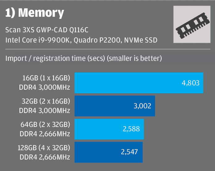 Based on our observations, for best price / performance we’d probably recommend a workstation with 64GB. 128GB will give you more scope for multitasking and help future proof your workstation when Cyclone Register 360 is able to better exploit the additional memory. However, it’s important to note that not all workstations (especially mobile workstations) can support 128GB. 32GB is still usable, but 16GB looks to be too little, having a significant negative impact on import time. If your machine only has 16GB we’d strongly recommend you upgrade straight away. See chart 1 below for more details.