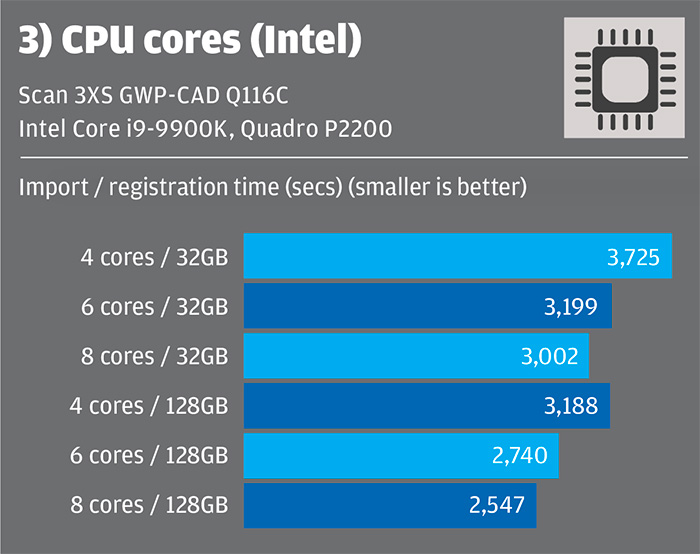 Both CPUs are significantly faster than the quad core CPUs typically found in a CAD or BIM workstation, two years old or more. The importance of the additional cores is illustrated in two tests — 1) when disabling some cores in the Intel Core i9-9900K (see chart 3 below) and 2) when comparing both CPUs to the older Intel Xeon W-2125 (Q3 2017) and Intel Xeon E3-1245 v5 (Q4 2015) CPUs (see chart 2 below).
