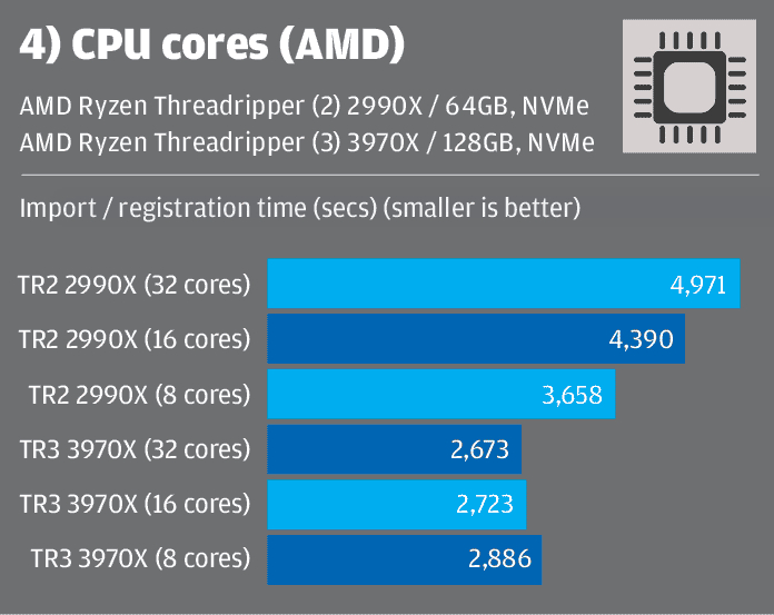 It will come as no surprise that as more CPU cores are used, import time goes down. But before you rush out to buy a 64-core AMD Threadripper workstation it’s important to note there are diminishing returns the higher you go. What’s more, having those cores run at a very high frequency is equally important and GHz tends to go down as core count increases.