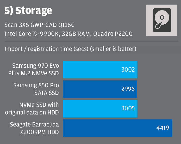 While PCIe NVMe SSDs boast significantly higher sequential read / write speeds than SATA SSDs, this only really benefits workflows that use large continuous datasets. This is not the case for RAW point cloud data from the RTC360, nor the project data created by Cyclone Register 360.