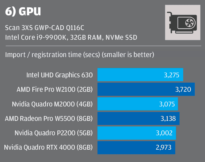 We tested a variety of pro GPUs, and while import was faster with the topend Nvidia Quadro RTX 4000 (8GB) it didn’t make that much difference to the overall import time, especially compared to the Quadro M2000 (4GB), which is a few years older and costs significantly less (see chart 6 below).