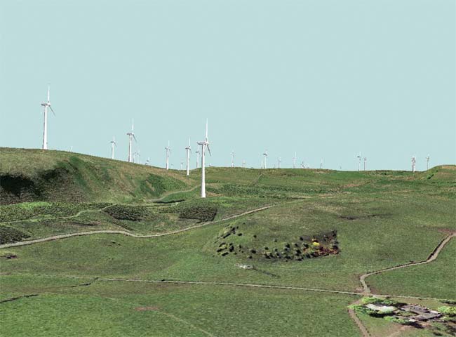 Windfarm development is another area requiring significant investment in terrain data and visualisation techniques both for energy modelling and site planning but also for visual impact assessment. Viewshed analysis and intervisibility studies (see Figure 2) are used for site selection, planning application submission, consultation and so on. Backdrop mapping, digital terrain models and aerial photography enable the creation of near real world models that clarify the development proposition to stakeholders and allow engineers to iterate turbine position in response to wind models, accessibility, surface geology and visual impact.