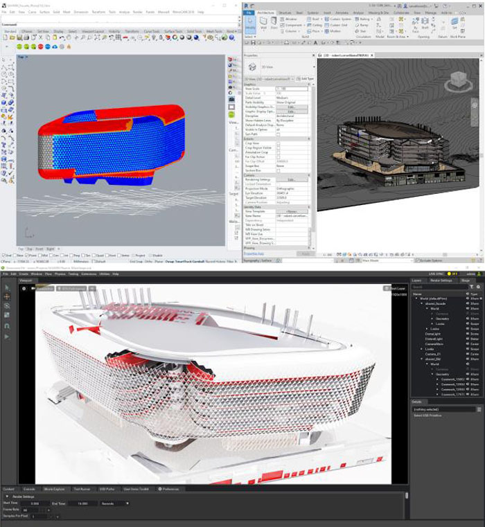 Kerris describes an example workflow where a global team is using a range of tools including Revit, Rhino, SketchUp and 3ds Max to work collaboratively on a building in China designed by KPF. Participants make changes to materials, windows and lights and various configurations within the scene. All of this is being managed in real time, across the globe.