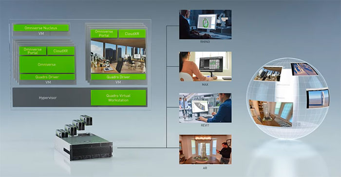 RTX Server can perform multiple roles. It not only provides buckets of processing power for real time ray tracing, but with Nvidia Quadro Virtual Data Center Workstation (Quadro vDWS) software users can access the Omniverse platform using GPU-accelerated virtual machines. It means all collaborators, including clients, can view projects in full interactive ray traced quality on low powered hardware – laptop, tablet or phone. AEC firms can also run their 3D design tools directly off RTX Server.