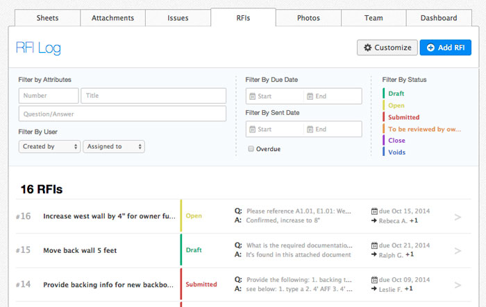 RFIs can be created directly from plangrid.com and references added, including photos, snapshots, or attachments. A status, a sent date and due date can then be set and assigned to one or multiple team members.