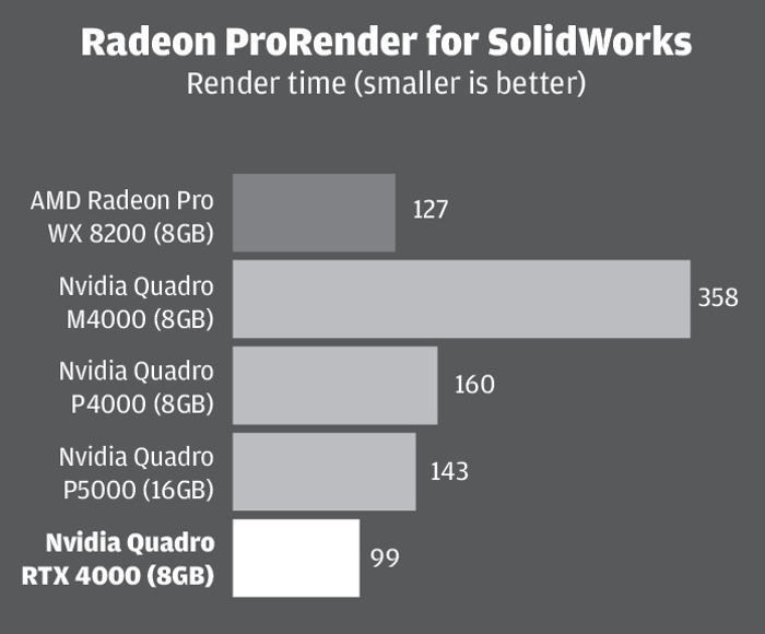 In Radeon ProRender for SolidWorks, an application whose benchmark scores are usually dominated by AMD, who develops the software, the RTX 4000 was about 20% faster than the AMD Radeon Pro WX 8200.