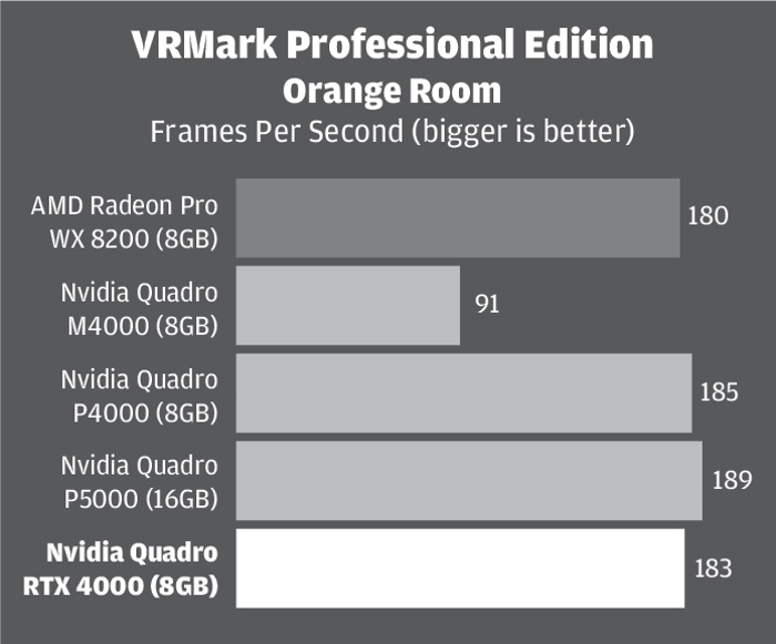 In the DX 11-based Orange Room test the RTX 4000 was actually slower than the other GPUs but we wouldn’t place too much importance on these results as the scores were away above what one generally needs for VR. In the more demanding Blue Room test which is designed for next generation VR headsets, it had a small but significant lead.