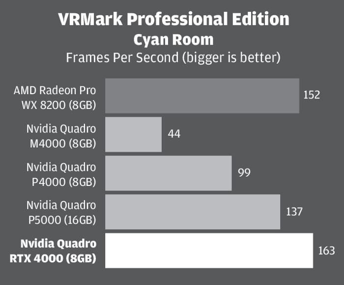 It even managed to beat the AMD Radeon Pro WX 8200 in the DX 12-based Cyan Room, a test that AMD usually does well in because AMD’s Vega architecture is designed to perform well with low-level APIs like DirectX 12 and Vulkan.