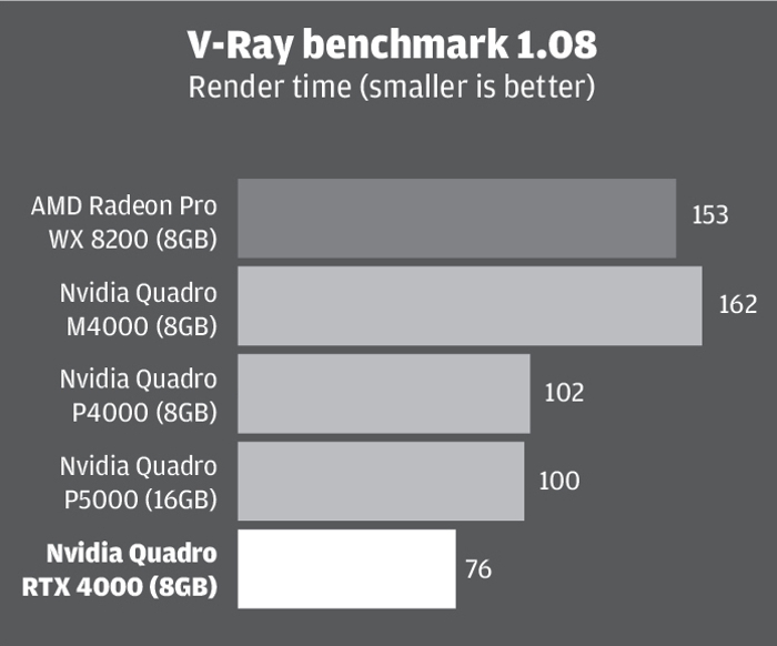 We also tested the RTX 4000 with two other GPU rendering applications. In the V-Ray benchmark it was an impressive 25% faster than the P5000, although this is all about raw ray tracing performance as the benchmark doesn’t take advantage of the AI denoising capabilities of V-Ray NEXT.