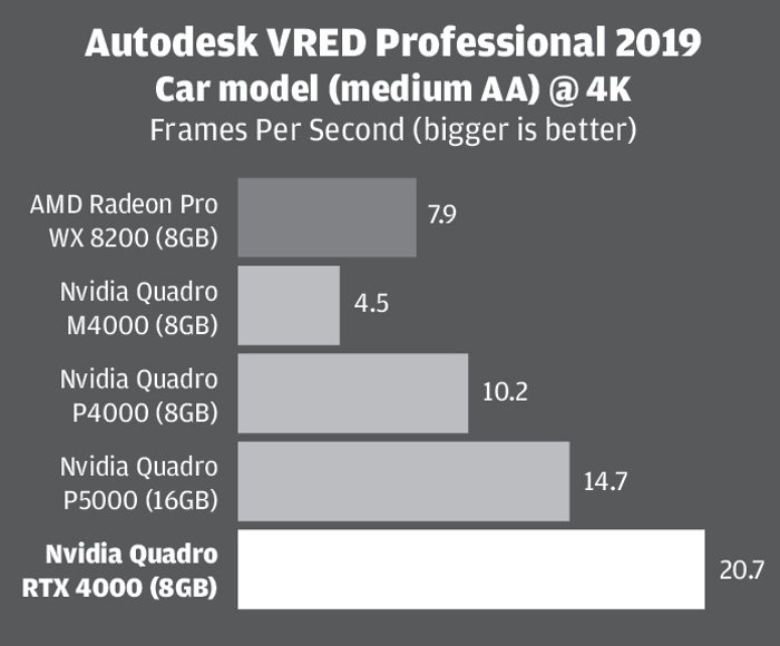 Autodesk VRED Professional 2019 is an automotive-focused 3D visualisation, virtual prototyping and VR tool. It uses OpenGL 4.3 and delivers very high-quality visuals in the viewport. It offers several levels of real time anti-aliasing (AA), which is important for automotive styling, as it smoothes the edges of body panels, but AA calculations use a lot of GPU resources, both in terms of cores and memory. We tested our automotive model with AA set to ‘off’, ‘medium’ and ‘ultra-high’.