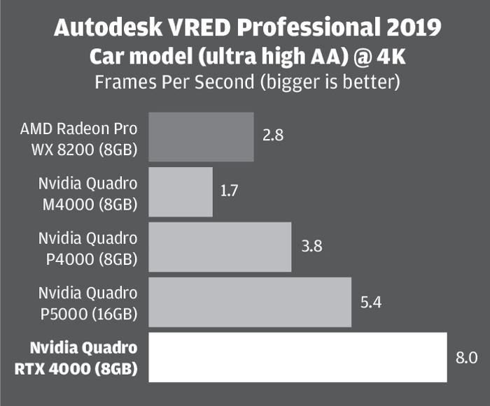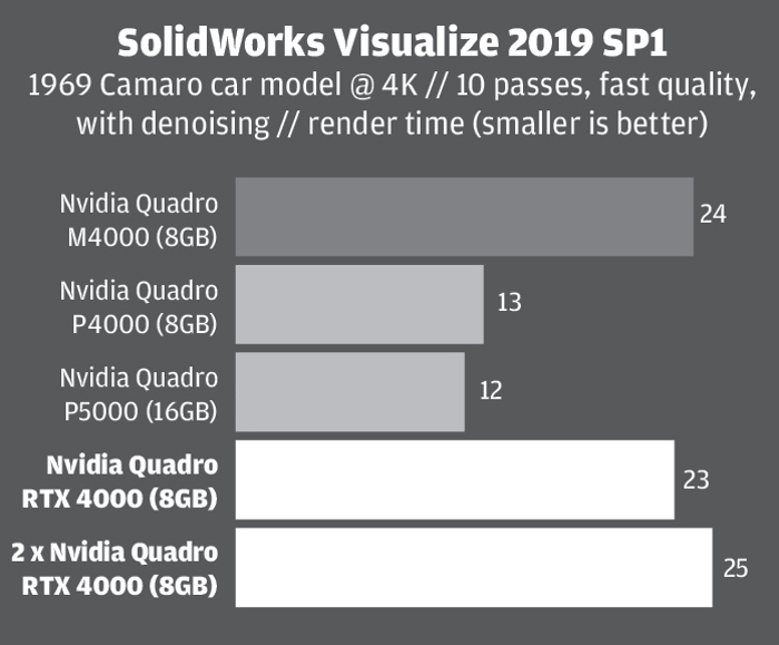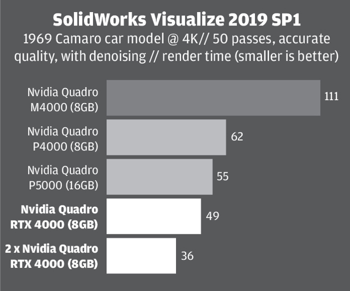 We put this to Nvidia and are still awaiting a suitable answer, but it would appear that the denoising calculations in Solidworks Visualize 2019 simply take longer on Nvidia’s Turing architecture than they do on Maxwell and Pascal. How this would impact your productivity will depend entirely on how you set up your renders in terms of passes and resolution, but it’s an important consideration as it could mean the RTX 4000 doesn’t give you as big a performance increase as you thought it might. Of course, this is a moot point if you don’t intend to use AI denoising. What’s more, everything may change in Solidworks Visualize 2020 anyway, when we imagine the software will be able to harness the Quadro RTX’s Tensor Cores for deep learning.