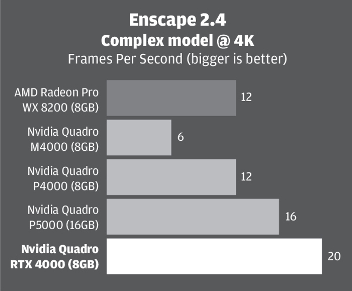 The Quadro RTX 4000 is probably the best fit for AEC Magazine’s key audience of engineers and architects, and is the focus for this review. It costs under £1,000 but offers incredible performance for the price.