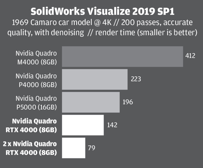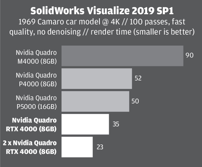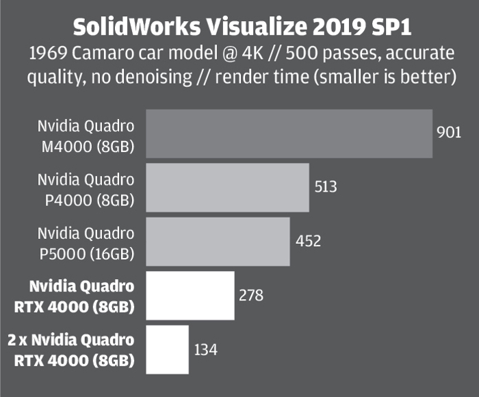 The RTX 4000 delivered its 100 pass render in a mere 35 seconds. But it took 500 passes to really see its true potential over the previous generation GPUs. It completed that job in just over half the time it took the Quadro P4000 and just under a third of the time it took the Quadro M4000. Adding a second Quadro RTX 4000 to the same workstation also cut the render time in two. We didn’t test the AMD Radeon Pro WX 8200 as it does not currently work with Solidworks Visualize. However, this could change in the future, as AMD recently demonstrated a technology preview of Solidworks Visualize accelerated on Radeon Pro GPUs.