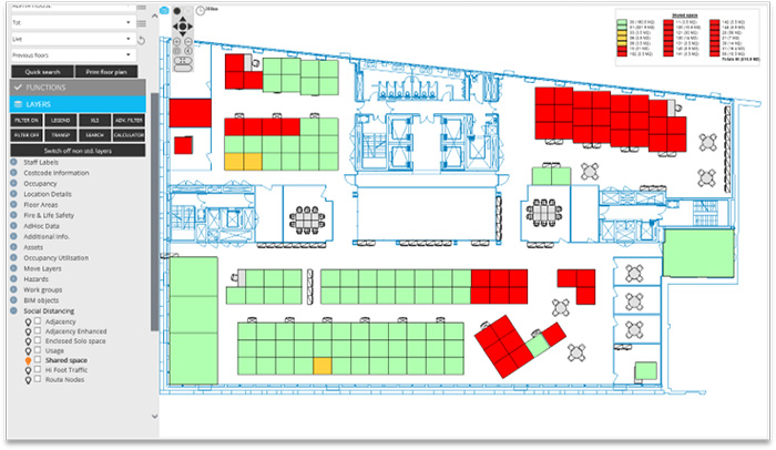 Graphical floorplans allow FMs to see ‘at risk’ areas as coloured overlaps, highlighting the number of times a desk or person would be in breach of social distancing guidelines. New layouts can then be designed and evaluated (either manually or automatically created by the software) to find the best solution for each area.