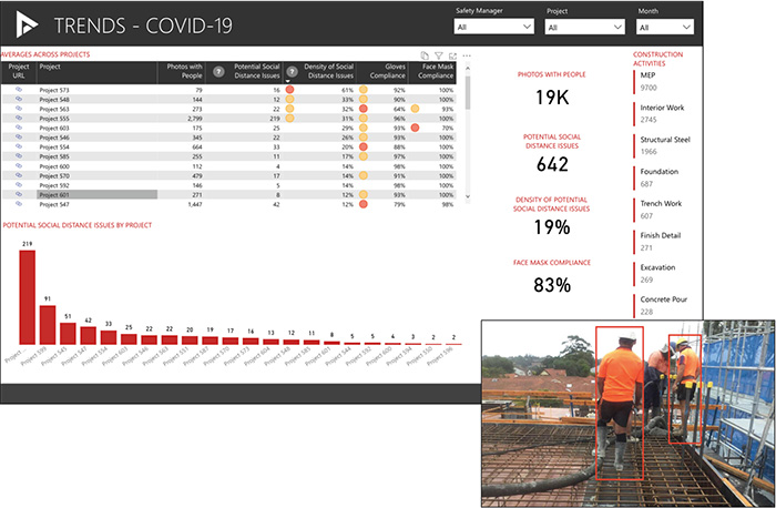 The software uses images or videos captured by onsite cameras, then uses its AI platform ‘Vinnie’ to automatically measure social distancing (i.e. to see whether workers are less than six feet apart or in larger than permissible groups) or to check if PPE face masks are being worn. The data can then be used to automatically create statistical reports to measure the percentage of workers in compliance.