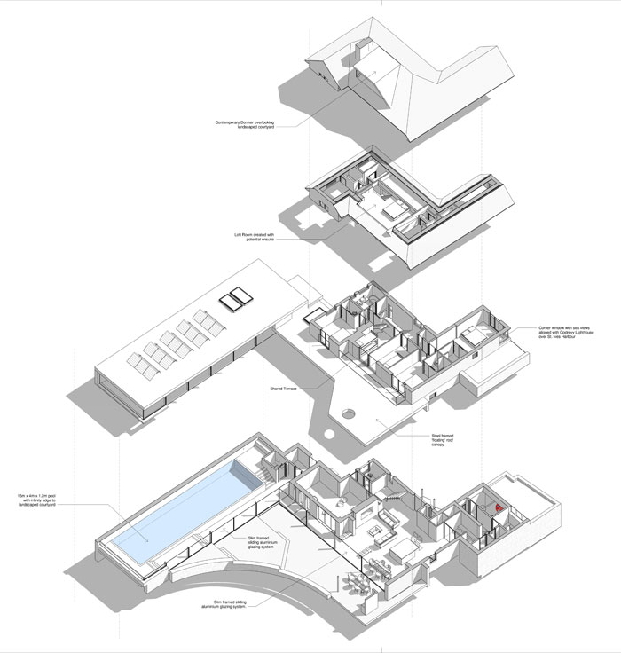 The benefits of utilising the technology were demonstrated at Rock House, a two-and-a-half storey replacement dwelling on Carncrows Rock, deep within St Ives’ conservation area. The design for this project sees a historic north gable retained, with the remainder of the building replaced by a contemporary reinterpretation of the existing one, maintaining its sea views and providing new ones from a mezzanine viewing platform.