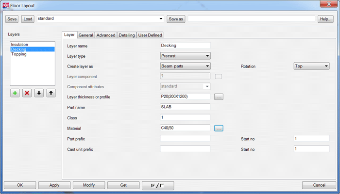 Sketch a floor layout and then define layer type (precast, cast in place, or insulation), thickness, material and class all from a single dialogue box. It is easy to add openings and break lines so you can very quickly take a whole floor and break it up on the support beam lines. It can also put in the end connection components, including rebated ends, notched ends and lifters.