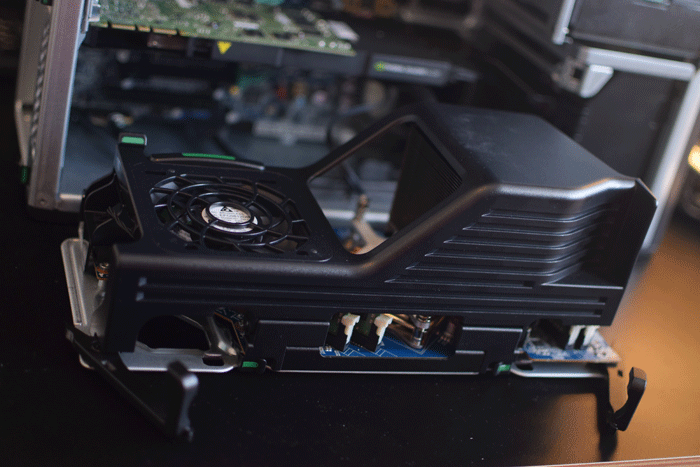 With the second CPU housed on a riser module, along with dedicated memory and cooling fans, a CPU upgrade can literally be done in seconds. There’s no messing about with thermal paste and heatsinks — levers, green touch points and blind mate connectors help mount the module effortlessly on the motherboard. It’s an extremely impressive piece of engineering that also results in a notably compact 175 x 465 x 445mm chassis (as the CPU and memory sits on a board of its own, less space is taken up on the motherboard).