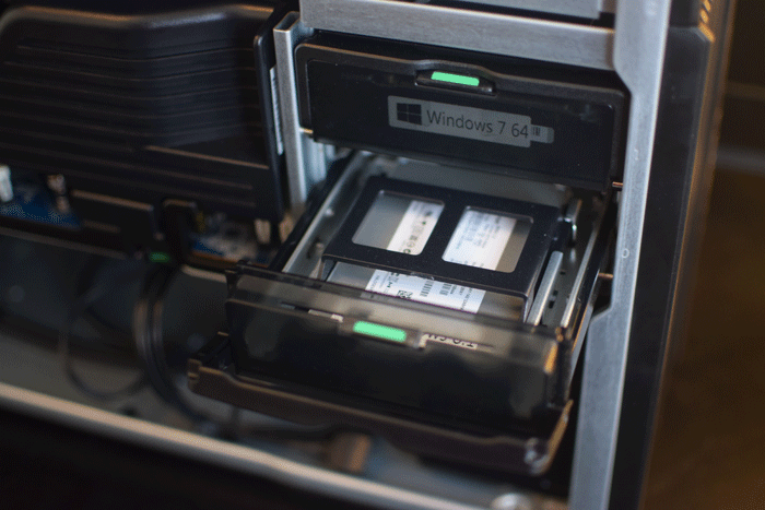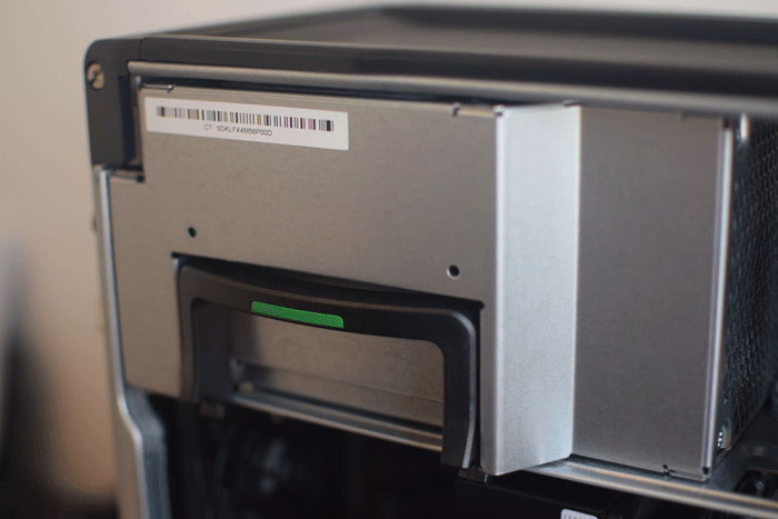 Storage is provided by a single 500GB Micron M550 SSD, which fills one of the two internal 3.5-inch bays by way of a 2.5-inch adapter. Both bays feature blind mate connectors, so there are no fiddly cables to play around with when adding drives.