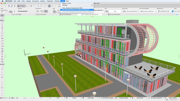 Once the link is installed, an SMC icon is added to the main menu bar in ArchiCAD. With a few clicks, the user can export the BIM model into SMC. From there, the user can highlight model elements and have them replicated in both solutions. If design faults are found by SMC, the same elements can easily be selected in ArchiCAD for corrections to be made.