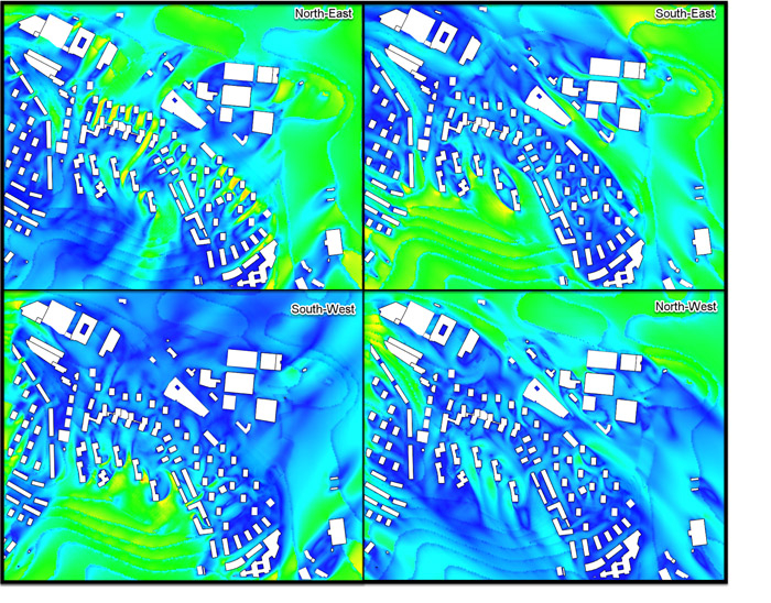 Pedestrian zones were selected at certain heights above the terrain, to match local conditions and project requirements. The simulation tool then computed the calculations in all directions (in this case, 16 directions).