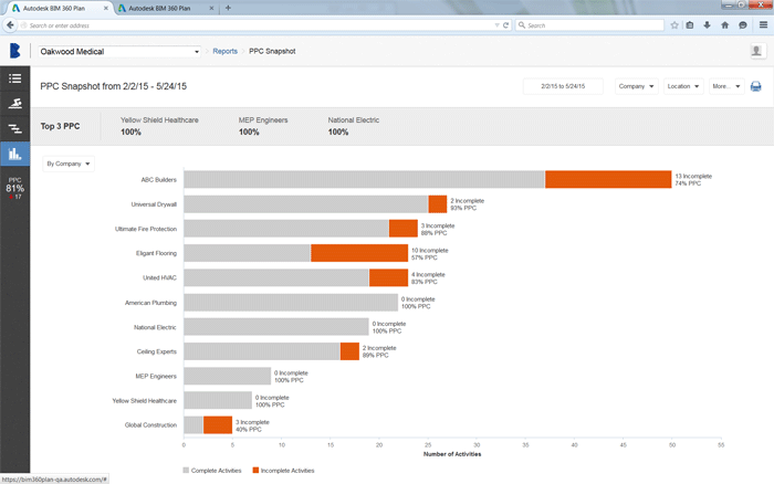 BIM 360 Plan is based on lean construction principles and provides an easy to use front end to collate construction plans across multiple teams and disciplines, displaying commitments, deadlines and hand offs. The software tracks performance metrics by phase, trade or location.