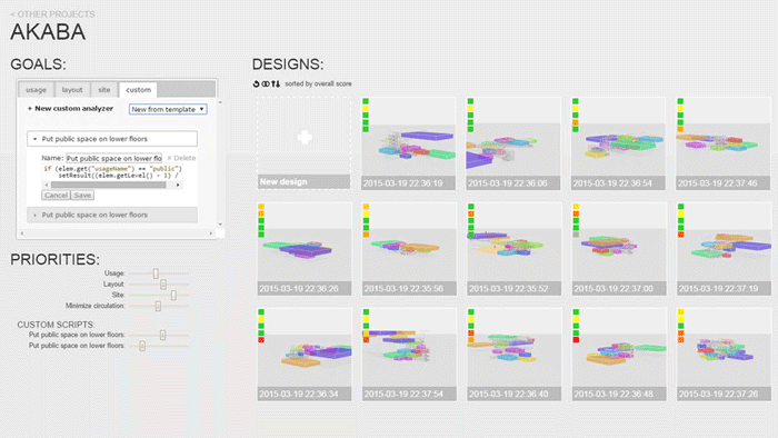 Project Akaba has a very clean interface with an entry point for Goals, and Project criteria, using sliders. The main display shows an array of solutions organised by score of meeting the initial design goal. This really is exciting stuff. Autodesk has similar plans for Urban-level city planning tools.
