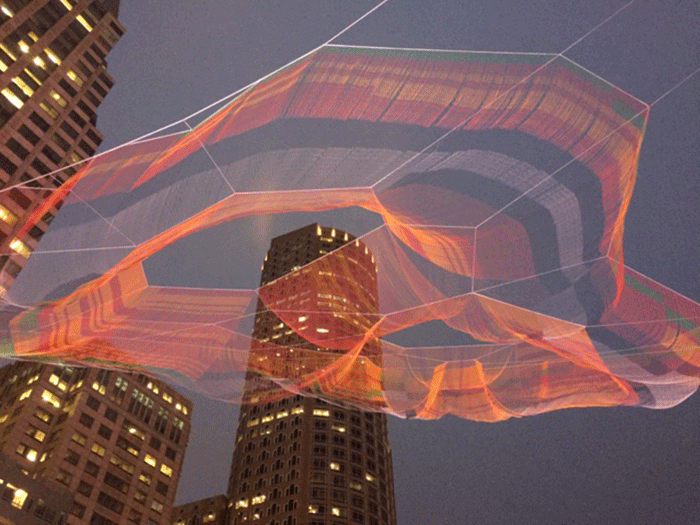 Located in the North End area Autodesk’s new building looks out onto the inner harbour, and is due to open next year. The AEC summit was held in one of the as-yet untouched spaces, which, while being just a shell, will be a really impressive space once completed. The main problem for Autodesk here is, as it is the AEC division moving in, there are many ex-architects turned employees that will want to have their say on the refit and layout! Janet Echelman Autodesk took us to see an art installation at Boston’s Rose Kennedy Greenway. The work by Janet Echelman, called ‘As if it were Already Here’ is handmade from over 100 miles of tensioned, coloured rope, tied together with over half a million knots, suspended between three downtown skyscrapers. The net forms three voids, which represent the three hills that were raised to create Boston Harbour