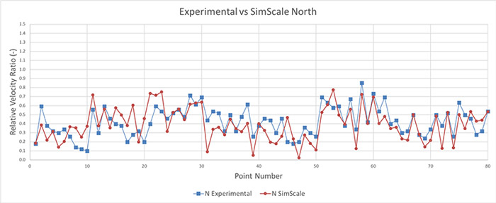 The correlation between the wind tunnel experiment and SimScale’s simulation results was highly linear, with a majority of the points being within 0.2 in relative velocity. The images below show the velocity comparison for a strong northerly wind.
