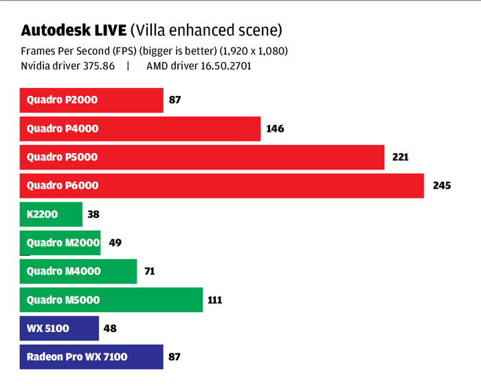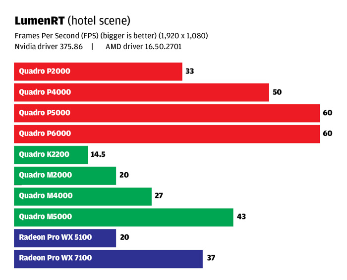 We saw similar results in game engine AEC-focused applications, Bentley Systems LumenRT and Autodesk LIVE, with significant performance gains over the previous generation and good scaling up the range. Our most demanding LumenRT test model, a large roundabout scene complete with animated cars and vegetation, certainly benefitted from the Quadro P4000, delivering almost double the frame rate of the Quadro P2000. As with VRED, moving to 4K would likely mean frame rates drop significantly, again making a strong case for the more powerful Quadros.