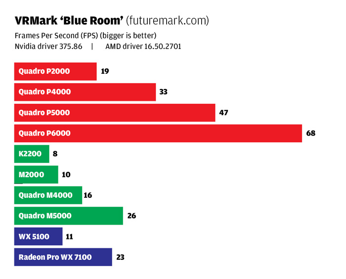 In VRMark’s Orange Room, a games-focused VR benchmark, it was 31% faster than the Quadro M5000 and passed the ‘VR Ready’ pass mark of 109 FPS comfortably.