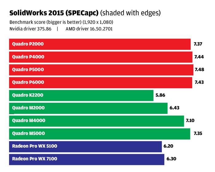 The higher-end ‘Pascal’ GPUs – the Quadro P4000, Quadro P5000, and Quadro P6000 – showed no discernible benefit over the Quadro P2000 in shaded with edges mode. While we didn’t test the lower-end Pascal Quadro GPUs, we would expect to see similar flat results, particularly with the Quadro P1000. On paper, this low-profile GPU, which fits standard desktop and Small Form Factor (SFF) workstations, looks to be a good choice for those looking to use mainstream CAD tools simply for modelling.