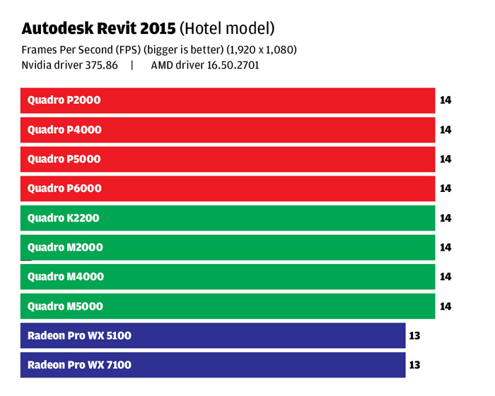 In architectural BIM software Autodesk Revit, we saw absolutely no difference in performance between the Quadro P2000 and its predecessors, the Quadro M2000 and Quadro K2200. This was using a variety of test models in both shaded and realistic visual styles. Testing was done using frame rate capture software FRAPS and a 3DConnexion Space Mouse for consistent model rotation.