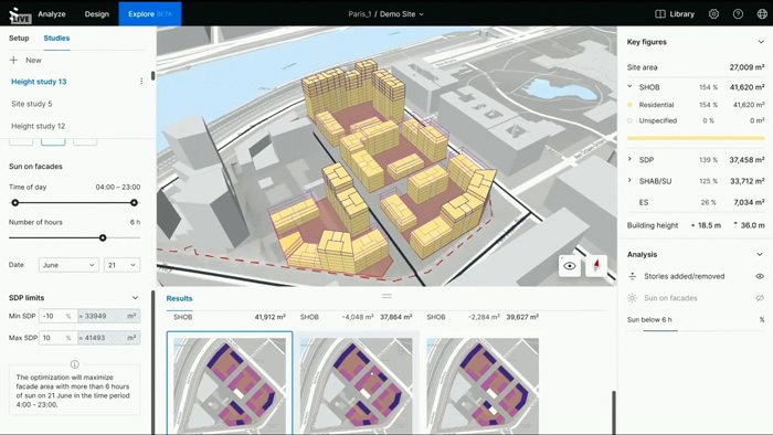 In the example given, if you’re interested in a plot of land for new apartments Spacemaker can explore in real time what the rentable area is, how many apartments are possible and what the lines of sight might look like. Users have the ability to assess as many criteria as they need right in the cloud, combining generative design to analyse factors like noise, wind, and sightlines, just to name a few.
