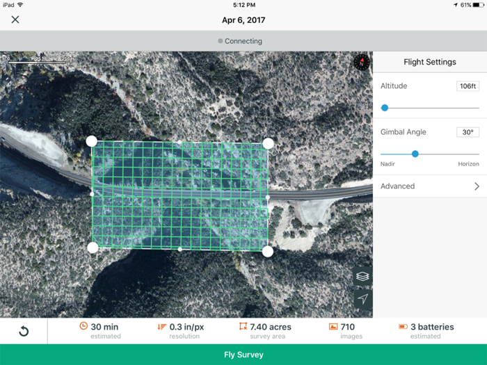 Jeremiah Johnson, solutions architect at 3DR, was the pilot for the day. He took off from the west end of the bridge, using the Site Scan app to plan the flight over the approximately 7.5 acre site. Johnson set up the crosshatch flight, and picked the appropriate altitude and gimbal angle for a scan of this size.