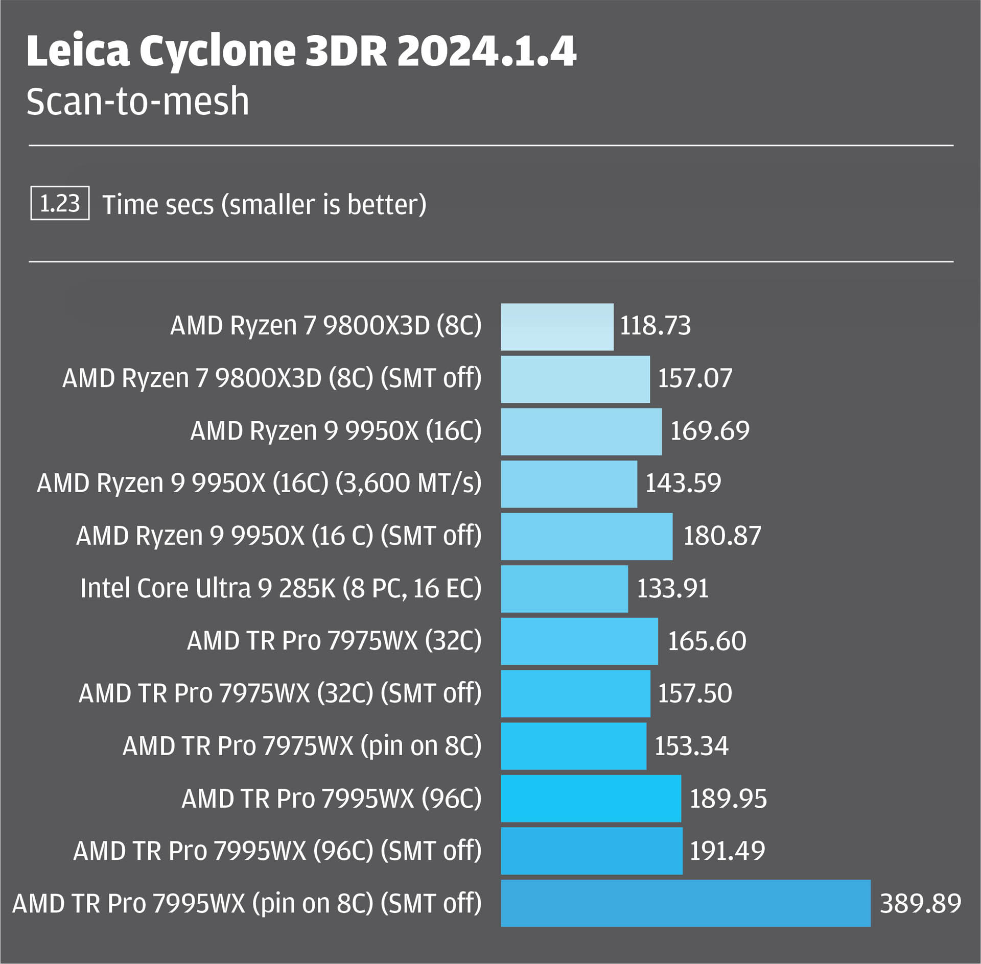 The process is multi-threaded, but certain stages only use a few cores. As with scan-to-mesh, more CPU cores does not necessarily mean faster results, and CPU cache, SMT and memory speed also play an important role. Again, the AMD Ryzen 7 9800X3D bagged first spot, completing the test 16% faster than its closest rival, the Intel Core Ultra 9 285K.