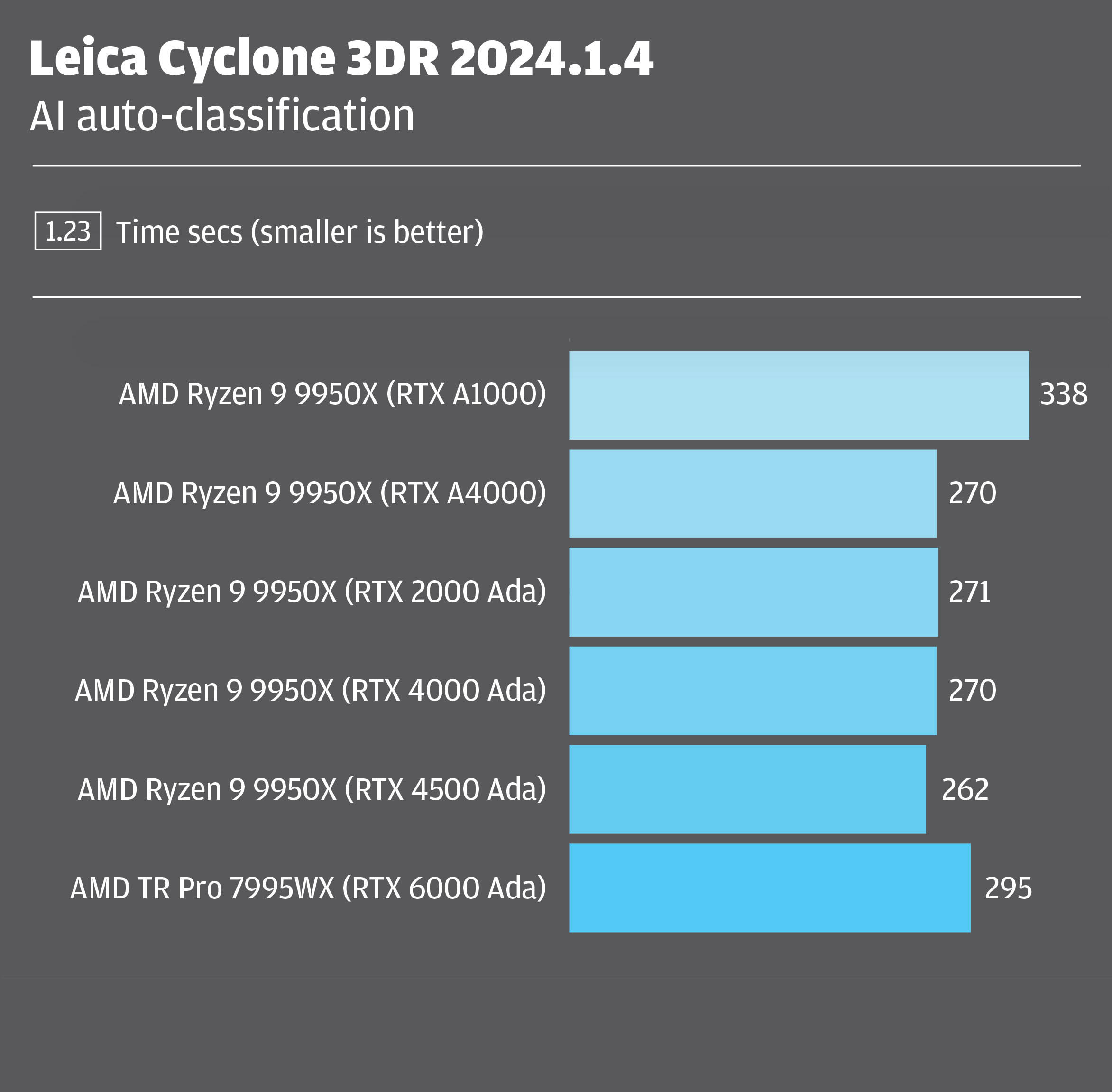 The Intel Core Ultra 9 285K processor led by some margin, followed by the 16- core AMD Ryzen 9 9950X and 96-core Threadripper Pro 7995WX. Interestingly, this was the one test where the 8-core AMD Ryzen 7 9800X3D was not one of the best performers. However, as the GPU does a small amount of processing, and Leica Cyclone Register 360 has a preference for Nvidia GPUs, this could be attributed to the workstation having the entry-level AMD Radeon Pro W7500 GPU.