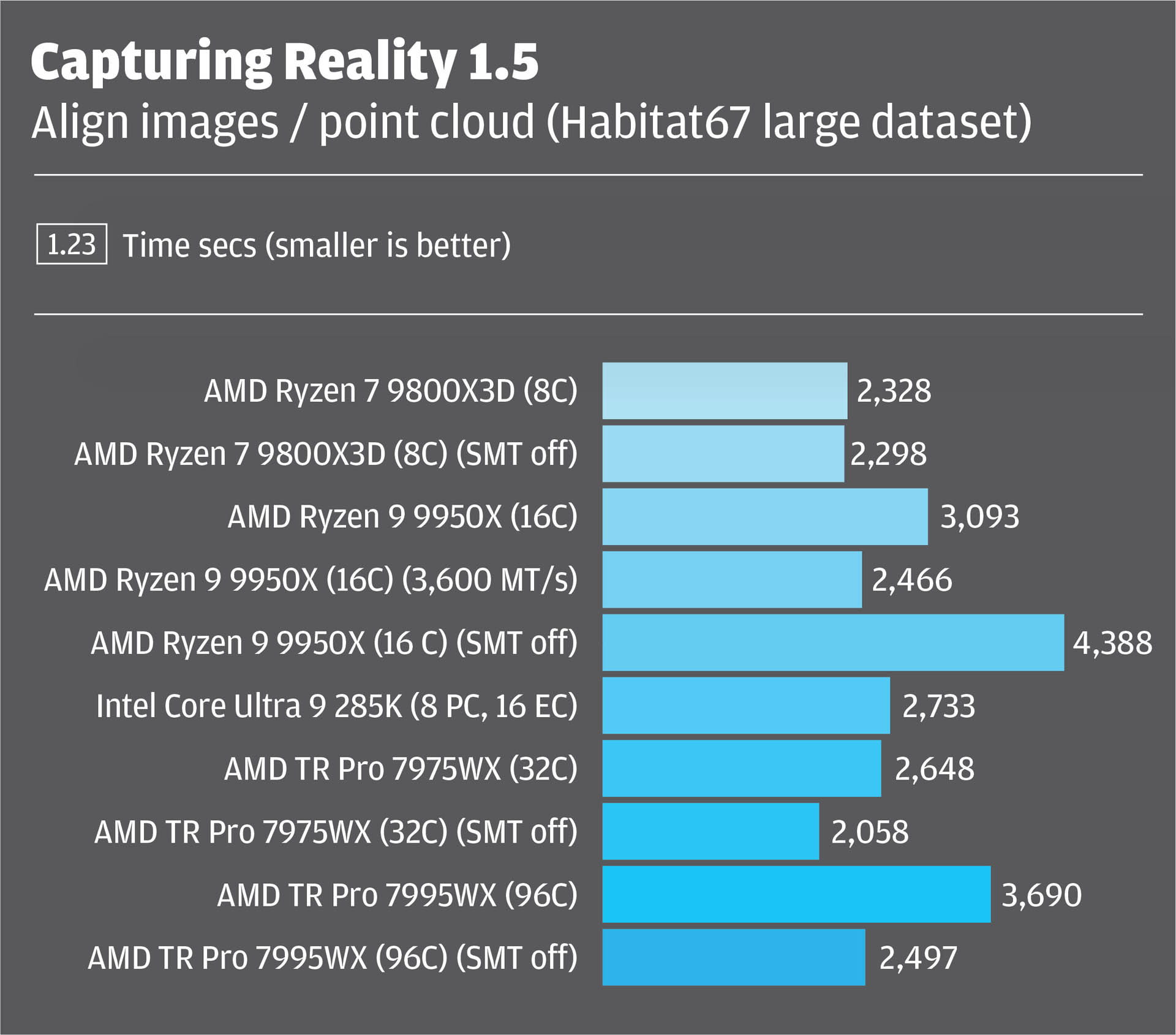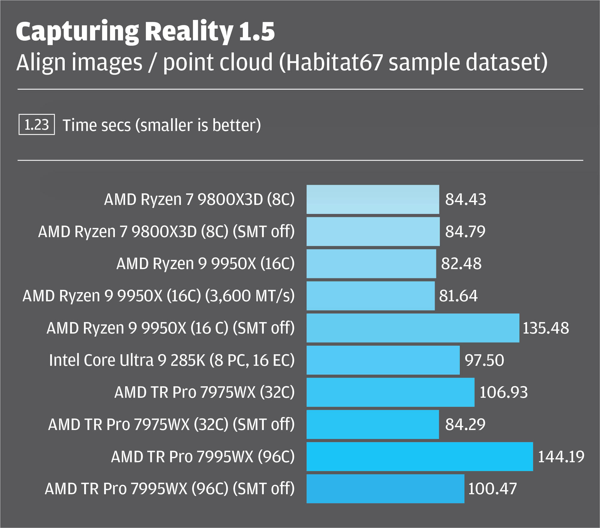 The process is multi-threaded but, as with many reality capture workflows, more CPU cores does not necessarily mean faster results. Other critical factors that affect processing time include the amount of CPU cache (a high-speed onchip memory for frequently accessed data), memory speed, and AMD Simultaneous Multithreading (SMT), a technology similar to Intel Hyper-Threading that enables a single physical core to execute multiple threads simultaneously. During testing, system memory usage peaked at 25 GB, which meant all test machines had plenty of capacity.