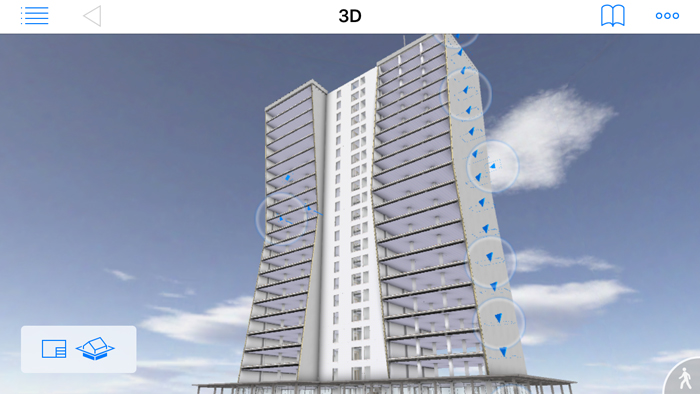 Instead of always having to explore the building along a linear path, BIMx lets you teleport between locations in the model using bookmarks. These are defined as cameras inside ArchiCAD and need to be added to the model before publishing the BIMx file. Bookmarks are also useful for giving clients guided tours of a building to highlight specific features.
