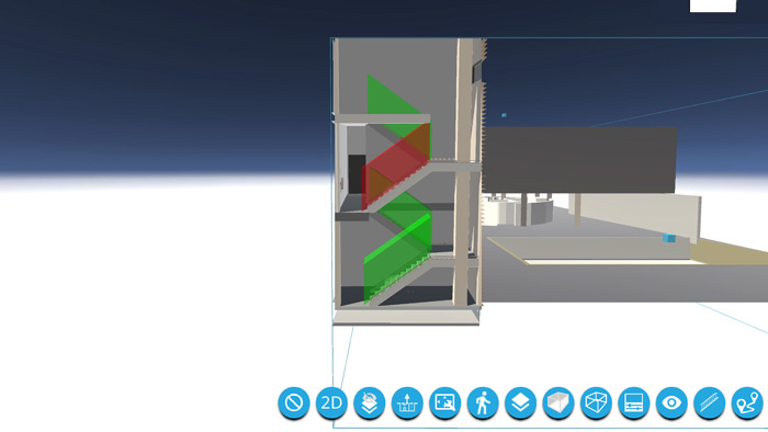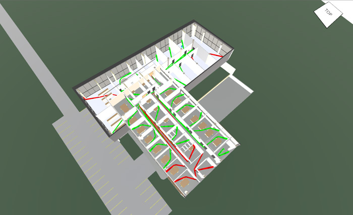 Egress: The speed of evacuating a building is important in many unforeseen circumstances. Verifi3D gives a very visual result, showing the paths from each of the rooms in a building. Should the path take too long or not be close enough to an escape door, these will be flagged in red. It’s possible to isolate any of the paths and the software will automatically section the model to show the escape route, even over multiple levels.