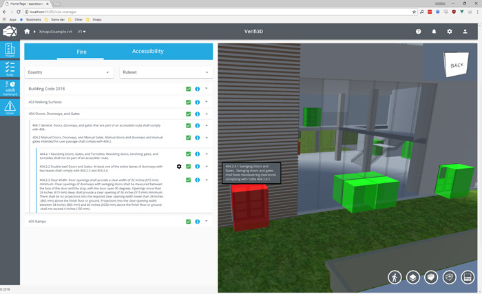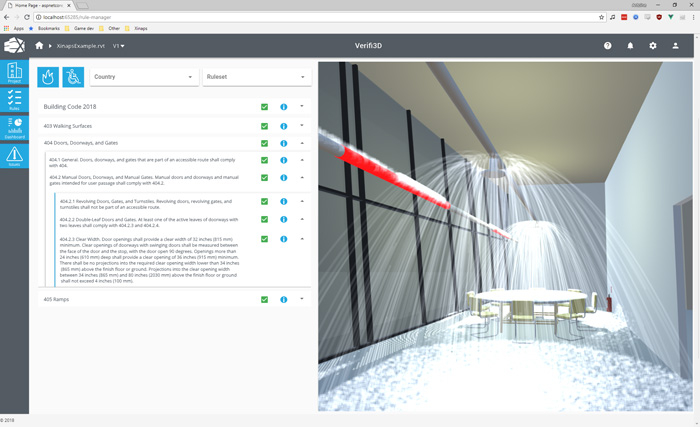 Based in Holland, Xinaps has been developing quality and rule checking applications for BIM models for almost three years. These have been commercial tools for the general public, as well as bespoke applications for large players such as Philips. As its business model and technology offering has evolved, the latest version of Verifi3D is almost ready for release, using a brand-new cloud platform to address some key design issues: disabled access, doors and gate clashes, stair head clearances, fire alarm egress paths, fire hose access, and water sprinkler coverage. Everything is done through a web browser.