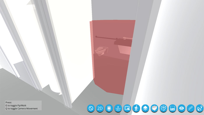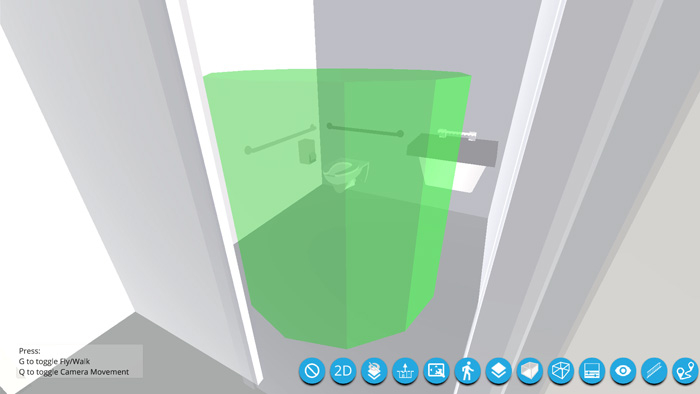 Disabled access: These tests cover a range of wheel chair manoeuvrability access issues, such as toilets and access to floors and exits. Design issues are again quickly highlighted and it’s possible to move about the model quickly, identifying areas which have failed the tests.