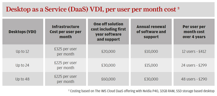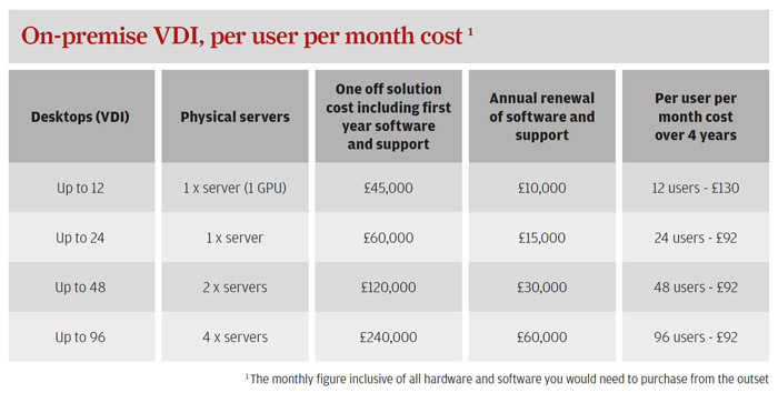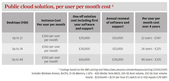 The public cloud offering is running on instances utilising Nvidia M60 GPUs. The cost has been calculated on a per instance, per hour cost for a 40-hour week, working 50 weeks of the year. For every extra hour worked on top of this, there will be extra cost.