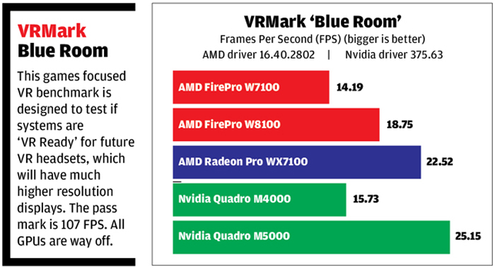 A quick run through the highly taxing ‘Blue Room’ showed just how much graphics technology needs to improve before it is capable of driving next generation VR headsets. The AMD Radeon Pro WX7100 and Nvidia Quadro M5000 put in scores of 22.5 FPS and 25.2 FPS respectively, way off the target 107 FPS. As of October 2016, Futuremark says that no publicly available commercial system is able to pass this test.