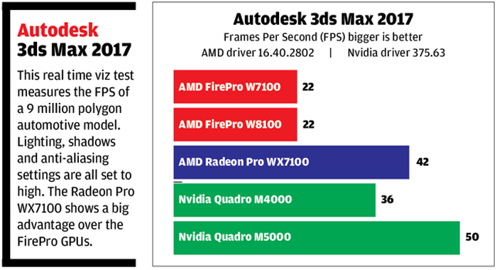 In Autodesk 3ds Max 2017, we ramped up all the lighting, shadows and anti-aliasing settings on a 9 million polygon automotive model. We rotated the model in a consistent way using a 3DConnexion SpaceMouse and captured the frame rate with a utility called FRAPS. As with the VR tests, the Radeon ProRender WX7100 came second to the Quadro M5000 (42 FPS versus 50 FPS), but there was a significant improvement over the previous generation AMD FirePro W7100 and W8100.