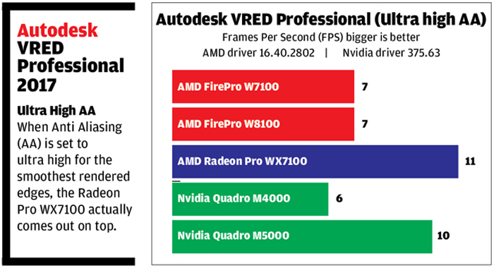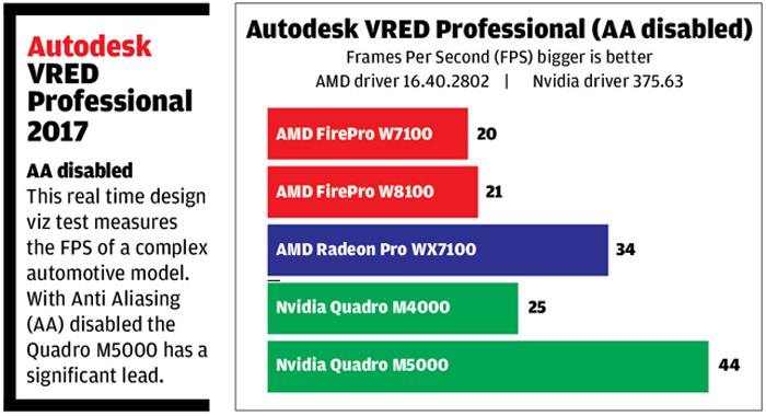 We followed a similar test process with Autodesk VRED Professional 2017. With anti-aliasing disabled the Quadro M5000 was just under 25% faster than the AMD Radeon Pro WX7100. However, when the anti-aliasing settings were ramped up to ultra-high, the Radeon Pro WX 7100 actually developed a small lead.