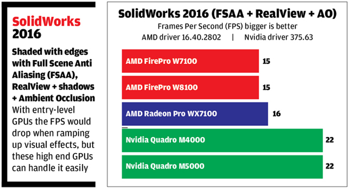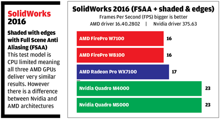 We tested with the SPECapc for SolidWorks 2015 benchmark, which aggregates the performance of 13 different models. While all three AMD GPUs delivered similar scores with RealView, shadows and Ambient Occlusion enabled, in shaded and edges mode the AMD Radeon Pro WX7100 was around 13% slower than the AMD FirePro GPUs.
