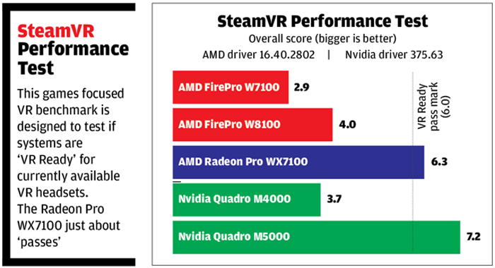 The Steam VR Performance Test is quite basic, in that it only gives an overall ‘fidelity’ score to inform you whether or not your system is capable of running VR content at 90 FPS. To be considered ‘VR Ready’ you need a score of 6.0 or above, so with 6.3, the Radeon Pro WX7100 only just passed. It was some way behind the Nvidia Quadro M5000 (7.2). All the other GPUs were way off the pace.