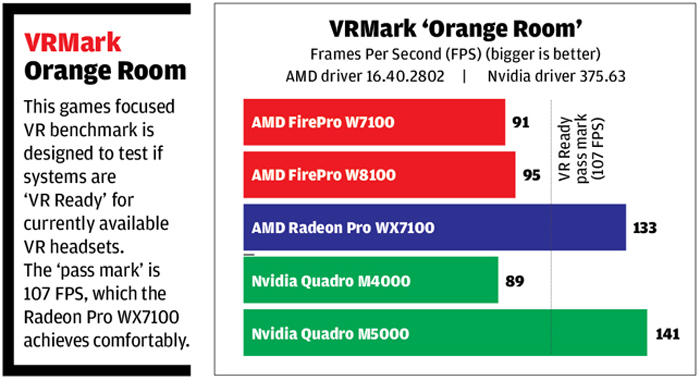 In the ‘Orange Room’, the AMD Radeon Pro WX7100 maintained an impressive 133 FPS, just a touch off the 141 FPS delivered with the Quadro M5000. As expected, none of the other GPUs passed the test.