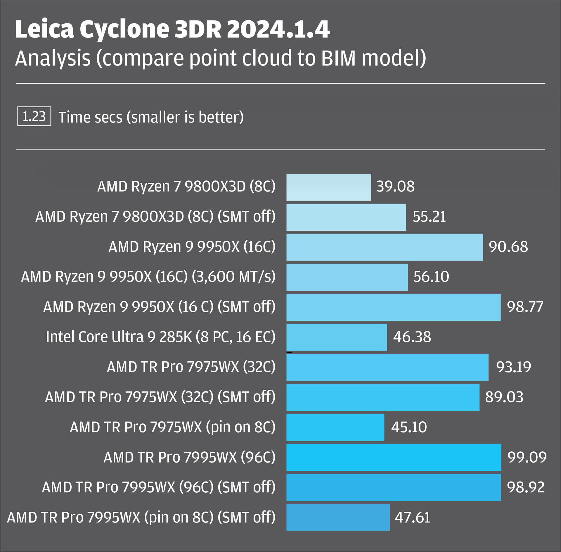 Getting good performance out of the Threadripper Pro processors required even more tuning. Disabling SMT on its own had a minimal impact, and it was only when the Cyclone 3DR executable was pinned to a single CCD (8 cores, 16 threads) that times came down. But this level of optimisation is probably not practical, not least because all workflows and datasets are different.